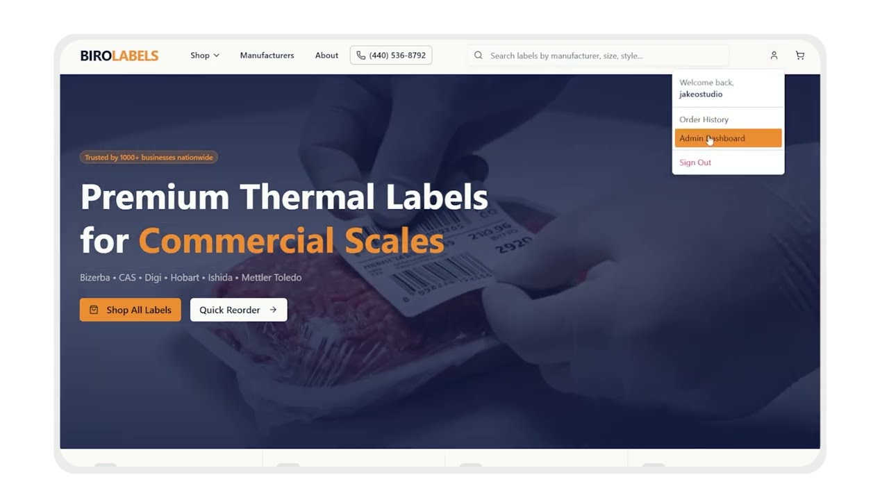 Biro Sales is a thermal label distributor serving primarily commercial grocery stores — the labels printed at meat counters, produce scales, and for UPC/safe-handling compliance. Their catalog spans 171+ SKUs across multiple manufacturers.
